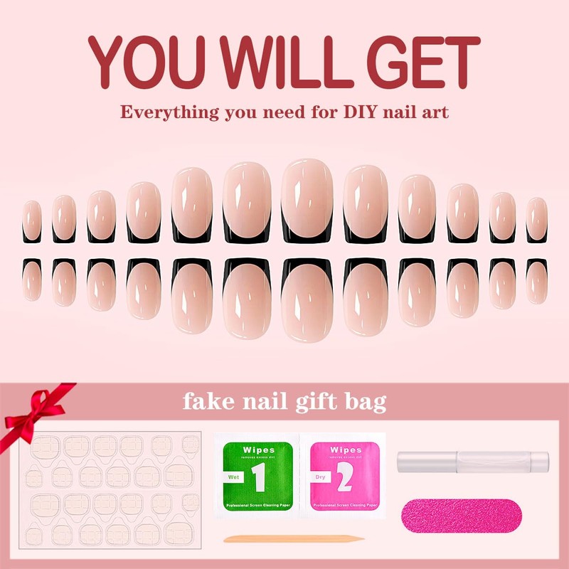 - 🌙[53-piece set] fake nails kit includes 24 fake nails, 24 gel stickers, 2 wet and dry alcohol packs, 1 glue, 1 wooden stick and 1 nail file.