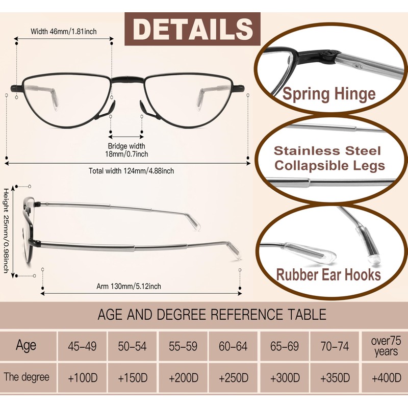 - 【CLASSIC FLAT TOP HALF FRAME DESIGN】The half-moon shape frame and the collapsible legs are made of high quality stainless steel with IP plating coating, the Soft rubber ear hooks at the end of the temple prevent the glasses from slipping off effectively, making the glasses sturdy and comfort to use; The small slim retro reading glasses,which looks like the bio-focal glasses, allow you to simply look down to read and observe your surroundings without taking them on and off continuously.