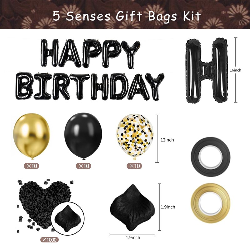 - El paquete incluye: Este kit de 5 bolsas de regalo incluye 5 bolsas de regalo, 10 piezas de papel de seda, 1 pancarta de globo "Happy Birthday", 30 globos metálicos, 1.000 piezas de pétalos de rosa y 3 hojas de calcomanías de letras. Cada bolsa se puede decorar por tu cuenta con calcomanías de letras con purpurina con letras inglesas [gusto], [tacto], [olor], [sonido] y [vista]; puede ser una buena manera de crear un regalo de 5 sentidos para tu ser querido, todo lo que necesitas añadir son los regalos en sí mismos