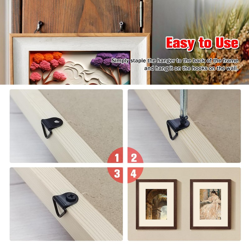 - Easy to Use The picture hanger is fixed with screws, easy to install and very suitable for wooden frames. Simply staple the hanger to the back of the frame and hang it on the hook on the wall.