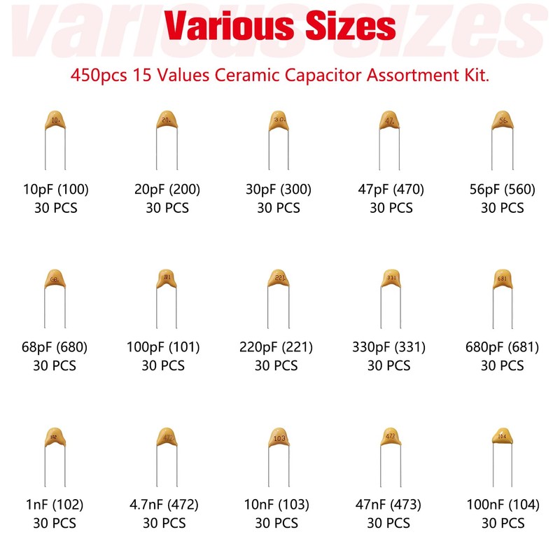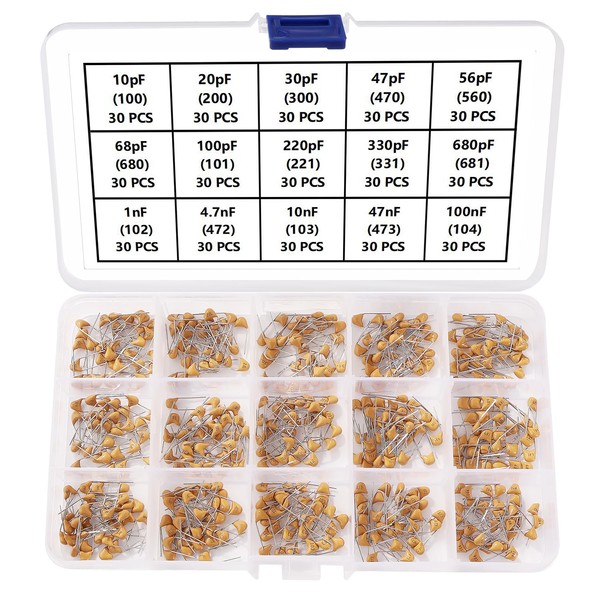 - Package Content:450pcs ceramic capacitor assortment with 15 values.