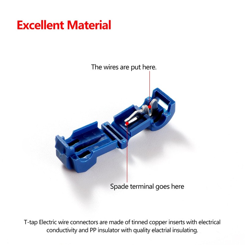 • Excellent Material: T-tap Electric wire connectors are made of tinned copper inserts with electrical conductivity and PP insulator with quality elactrial insulating.