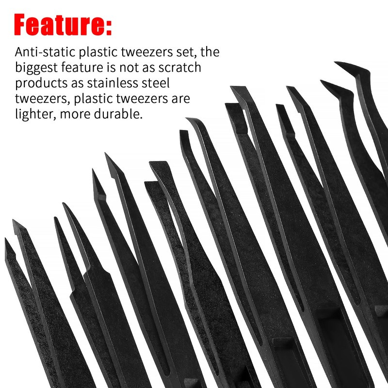 - Feature: Anti-static plastic tweezers set, the biggest feature is not as scratch products as stainless steel tweezers, plastic tweezers are lighter, more durable.
