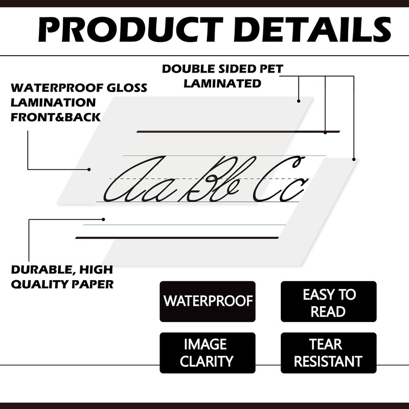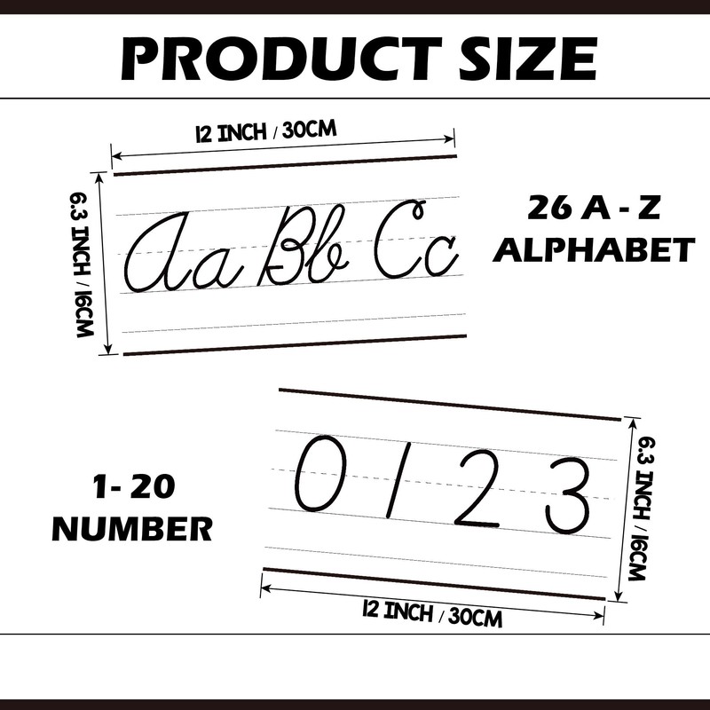 - High Quality: Each poster measures 12 x 6.3 inches/ 30 x 16 cm. Professionally printed educational cursive alphabet strips, crafted with high quality materials, double sided coated with laminated PET film layer for durability and visual clarity. They are waterproof, tear resistant, reusable and marks on them written by water-based dry erase markers could be erased