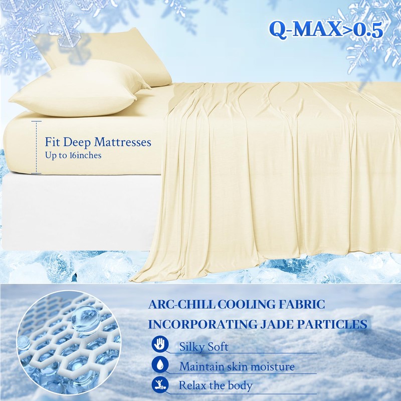 • 🧊Enjoy the Latest Arc-Chill Cooling Fiber Tech: Stay cool and comfortable all night with our cooling sheets that feature the latest Arc-Chill Extreme fabric(Q-Max>0.5) and infused with cool particles of Icy-jade that quickly absorb sweat and heat, lowering body surface temperature over 5℃ the moment your skin touches the cooling bed sheets. Bring you a refreshing and beautiful sleep, and say goodbye to the night sweats and hot sleepers.