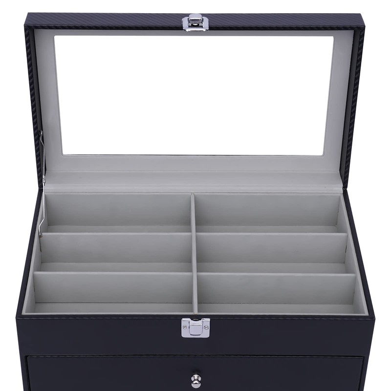 - Application This glasses display box is suitable for storing glasses, sunglasses, bracelets, watches, and other accessories. The large capacity and stylish appearance of this display box make it not only suitable for home use but also for business.