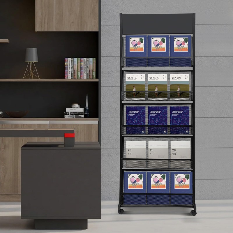 YIYIONCE Magazine Display Stand 5-Tiers Magazine Rack Brochure Display Stand with Wheels Literature Rack Cart 28"W x 70"H Floor-Standing Newspaper Rack for Offices Reception Area | US Stock