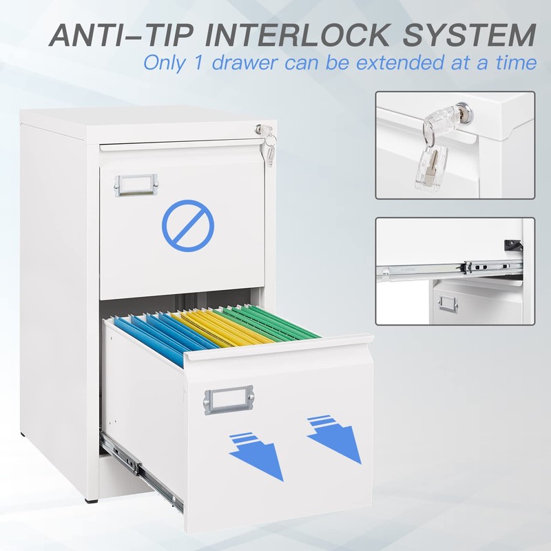 - 【Higher Level Security】The metal file cabinet is composed of exactly designed interlock device and external ANTI-TILT mechanism. Only one drawer could be opened at the same time for safety sake, combine this feature with the ANTI-TILT mechanism, this 2 drawer file cabinets ensures much more safety than others.