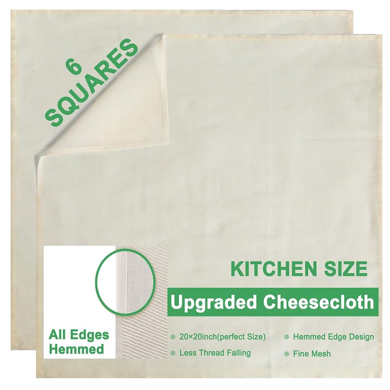 20x20 Inch Hemmed Cheesecloth is the perfect size for you to use and make straining easier! It is not shed lint and more durable because the hemmed edges around the cheese cloths will prevent it from tearing easily.