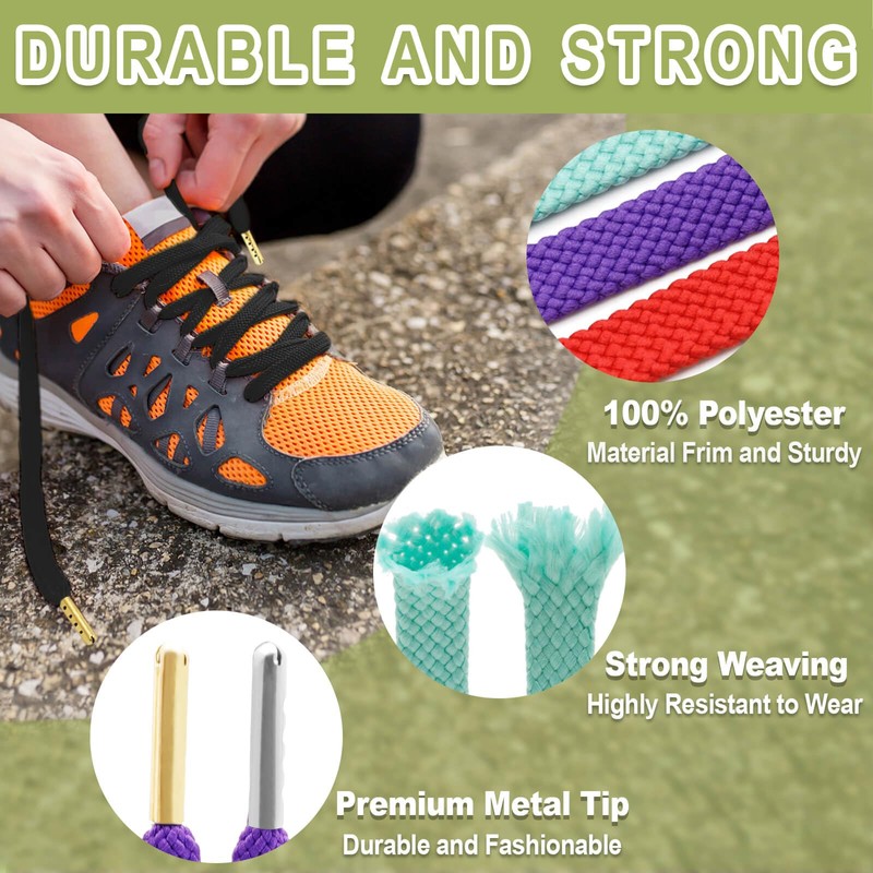 - Flat Shoelaces With Metal Tips: These are woven with multiple strands of polyester yarn. Double layer thickening and premium metal tips increase wear resistance, softness and durability. Excellent dyeing process ensures that these shoe strings retain their brilliant hues, even after multiple washes