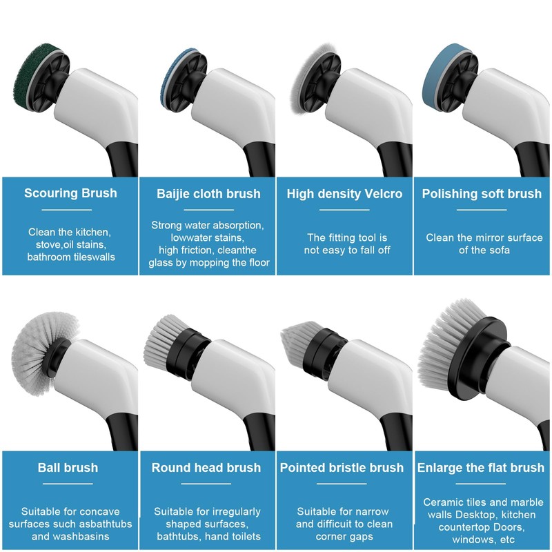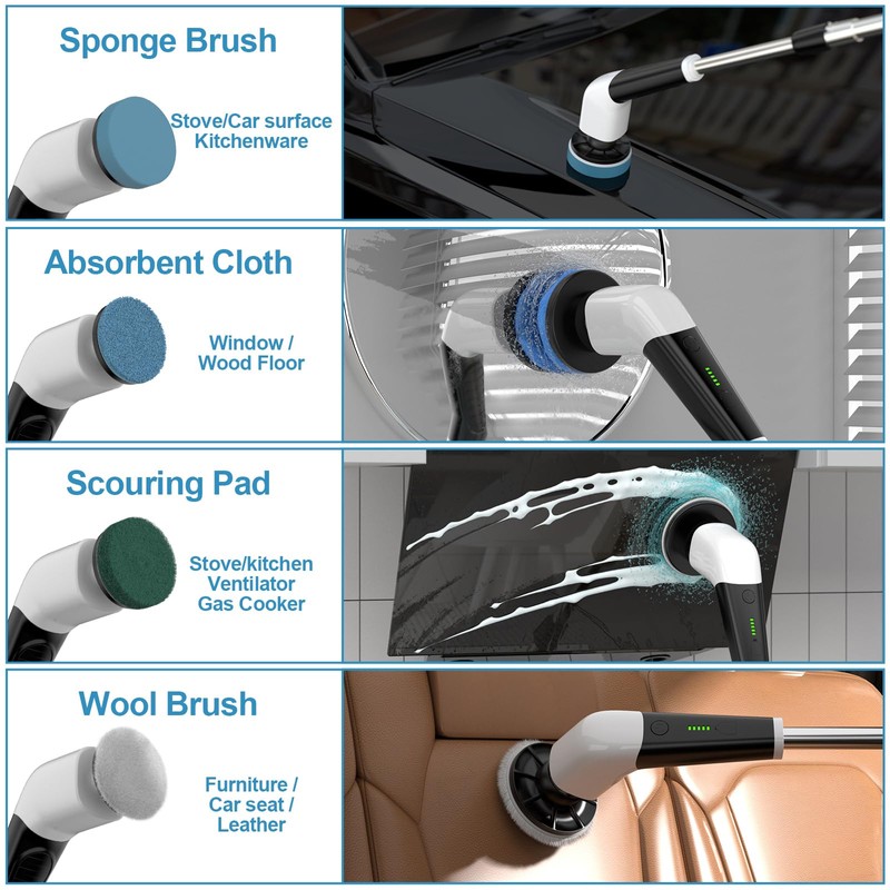 - 8 Specialized Brush Types for Precision Cleaning:Tackle diverse surfaces effortlessly with a curated set of brush heads: Large Flat, Small Flat, Dome, Corner, Scouring Pad, Sponge, Copy Wool, Absorbent Cloth, and Velcro attachments. Perfect for grout, tile, wood floors, faucets, and automotive detailing.