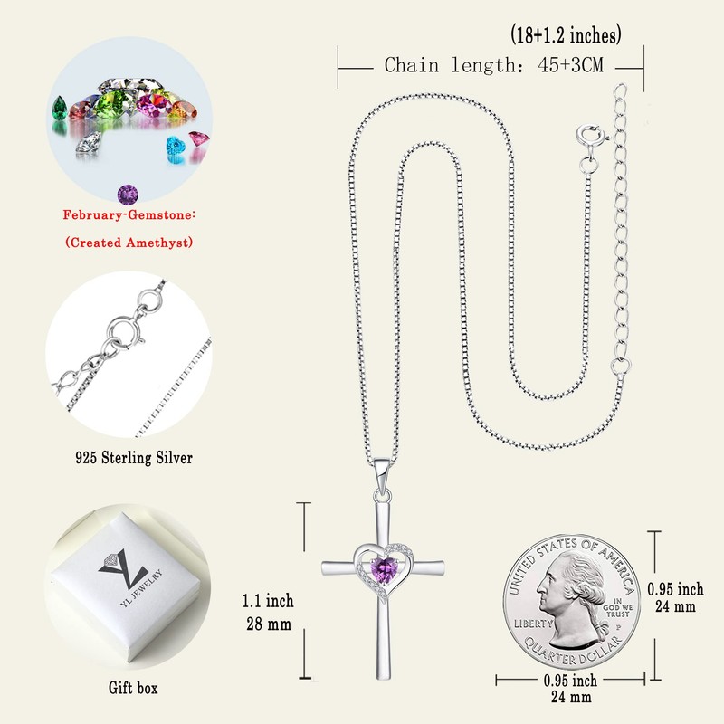 - ❤️ Cross Size - Cross high: 1.1 inches; Silver Box Chain: 18 + 1.2 inches; Set with heart-brilliant-cut created amethyst