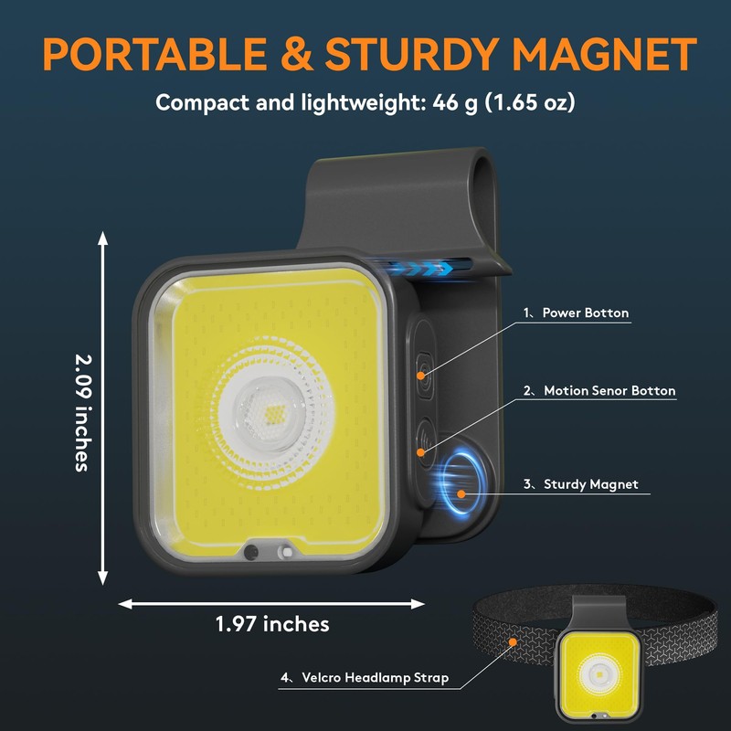 - [Ultra-Light & Sturdy Magnets & Velcro headband] Weighing just 1.65 oz (46g) and measuring 2.09 x 1.97 inches (5.31 x 5 cm), this running lights for runners is lightweight as feather. The magnetic strip allows easily clipped on collars, belts, backpacks, or hats, offering multiple wearable options. Use the included Velcro headband to transform the reflective running gear into a headlamp—ideal for running, working, and fishing. The headband’s high elasticity provides a secure, comfortable fit for any head size. The detachable magnetic strip also allows for direct attachment to iron surfaces, enabling convenient, touchless use