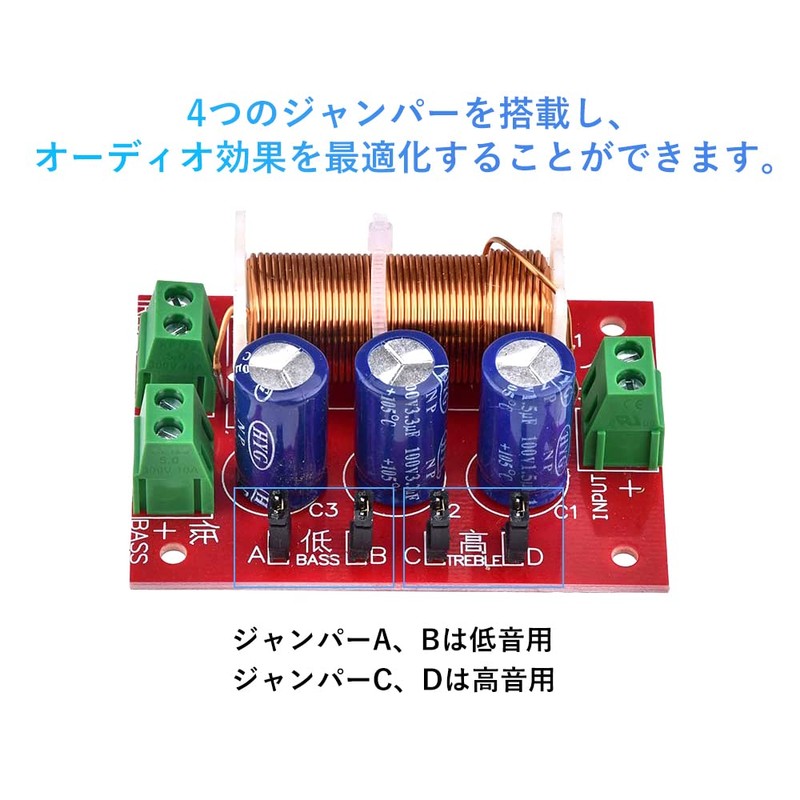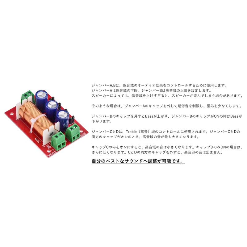 Jumpers A,B are used to control bass audio effects. Jumper A sets the lower bass limit, and Jumper B sets the treble limit. Some speakers may cause the speaker to warp if the bass is too high. In such cases, remove the cap of the Jumper A to limit the ultra-bass and reduce distortion. Remove the cap of the jumper B, the bass will raise and the bass drops when the jumper B cap is on. Jumper C and D are used for Treble range control. When both the jumper C and D caps are turned on, the treble sound is the loud. Only cap C is turned on, the treble sound will be smaller. If Cap D only ON, it will be lower When both C and D caps are removed, the treble sound will not be produced. You can adjust it to your best sound.