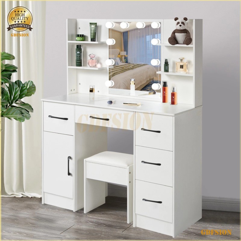 Ymaissi Makeup Vanity Dressing Table With Lighted Mirror Stool 6 Drawers Stroage Shelves