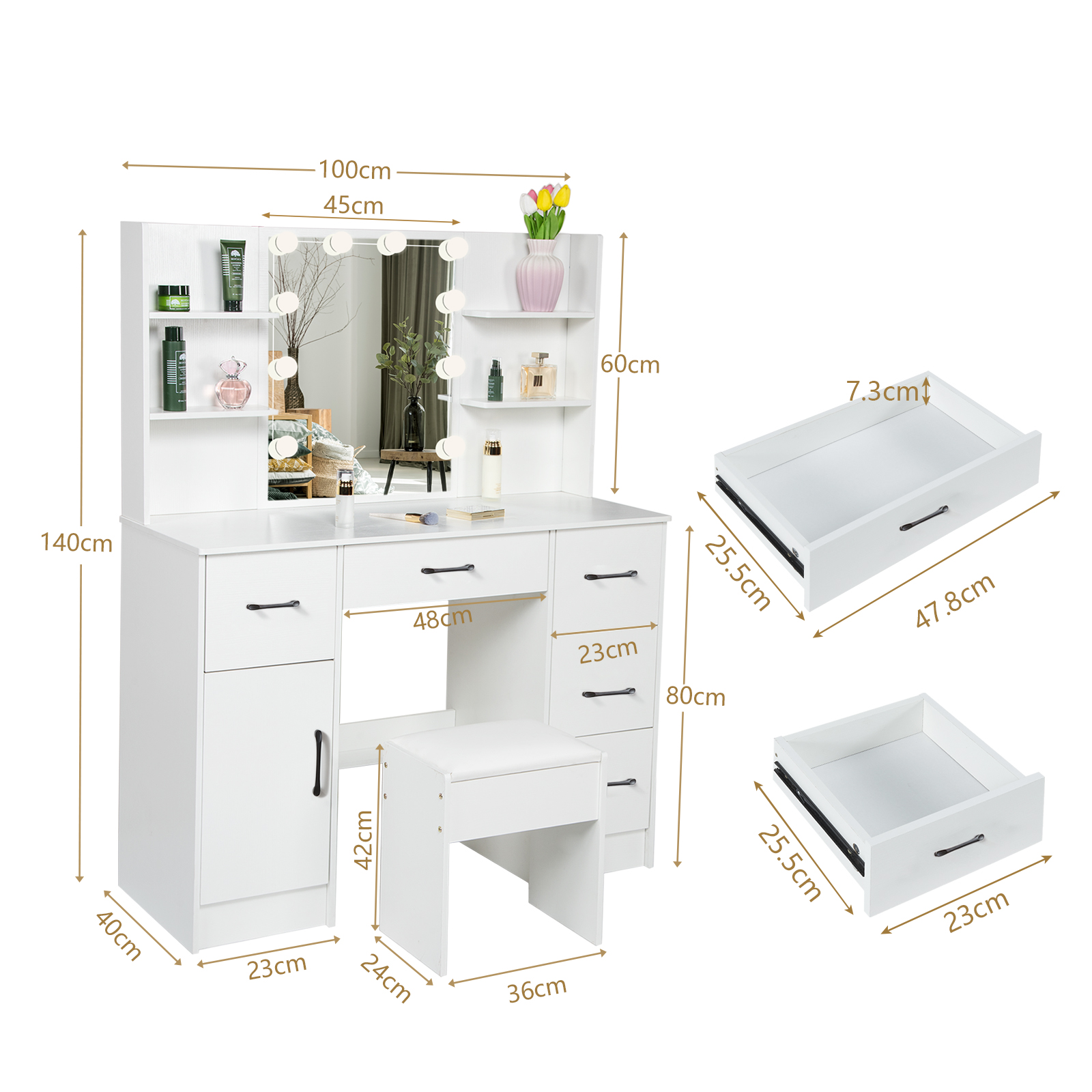 - Features: With Stool, With Drawers, With 10 Led Lights, With Cupboard, With Mirror, With Shelves, Stool Included, Mirrored, Flat Pack, High Gloss