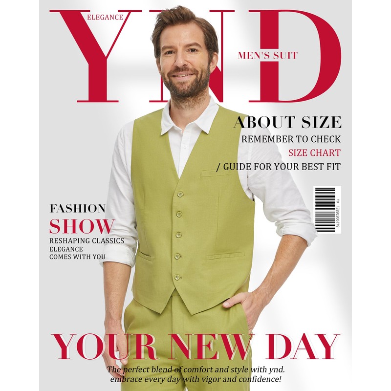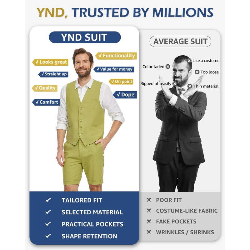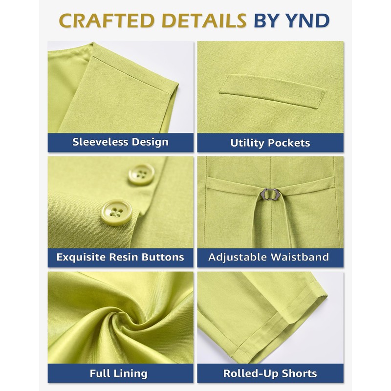- YND - YOUR NEW DAY: The vest features 3 functional pockets and 5 buttons. The pants have 4 practical pockets. The shorts are designed with rolled hems, ensuring breathability and ventilation for your legs, keeping you comfortable throughout the day