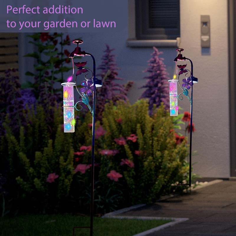 - DECORATIVE DESIGN: Beautiful garden rain gauge featuring vintage-style copper-finish faucet, decorative butterfly, and purple flower accents on a curved metal stem