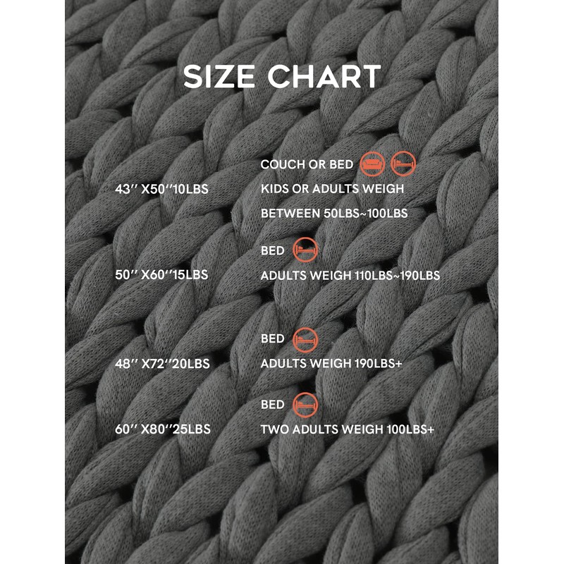 - [Sizing Options] Our blankets come in 5 different sizes: 43"x50" 10 lbs: Ideal for kids or adults weighing between 50 lbs and 100 lbs. 50"x60" 15 lbs: Perfect for adults weighing between 90 lbs and 140 lbs. 48"x72" 20 lbs: Suitable for adults weighing more than 110 lbs. 60"x80" 25 lbs: Can be used by one or two people over 160 lbs. 88"x88" 40 lbs: Designed for two people on a queen or king bed who prefer extra weight. Note: The 60"x80" size may be a bit small for two people to share comfortably.