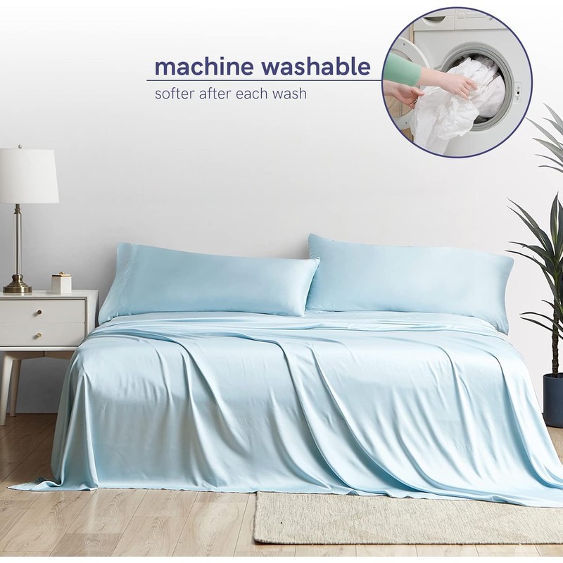 YnM Cooling Bed Sheet Set with 100 Percent Rayon Derived from Bamboo, 400TC Fabric with 1 Pillowcase and Flat Sheet, Deep Pocket Fit 19'', Silky-Soft & Sweat Wicking, 3 Piece (Twin, Light Blue)