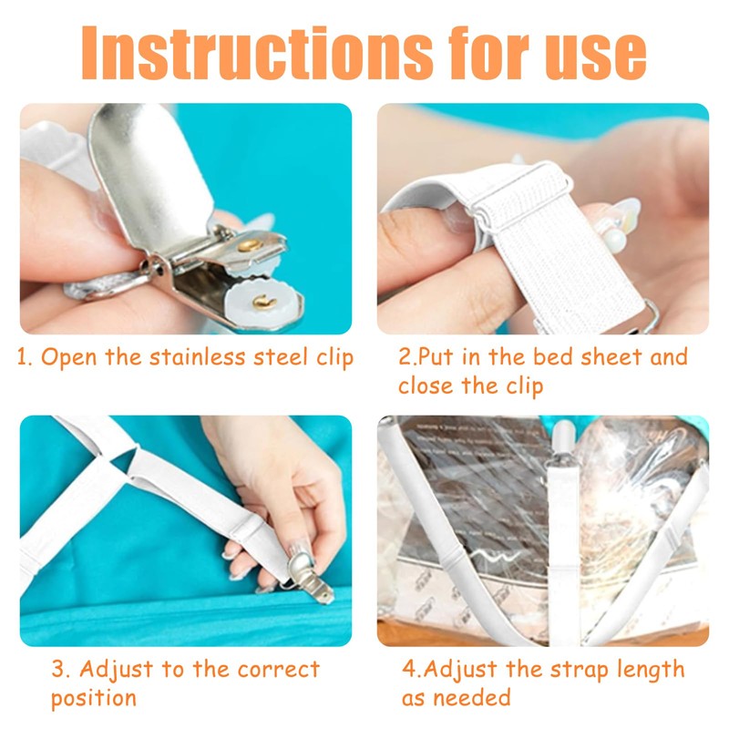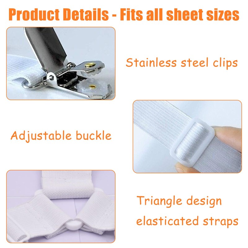 • COMPLETE SET: Package includes 8 adjustable triangle sheet fasteners with strong metal clips for securing bedding and other household items