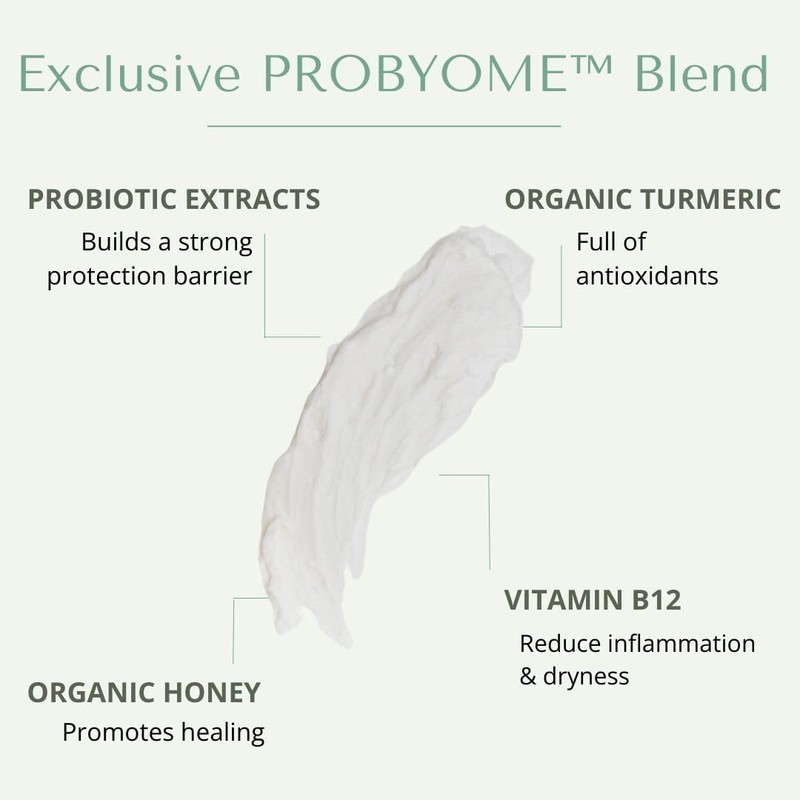 - PROBIOTIC POWERED, DERMATOLOGIST TESTED - This moisturizer for dry skin is powered by PROBYOME, a unique, patented blend of para probiotics, organic honey, organic turmeric & vitamin B12, protecting & supporting skin healing.