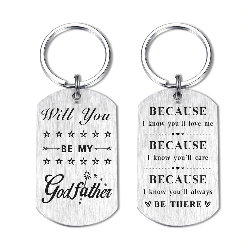 - Double-Sides Godfather Engraved Keychain - One side engraved "Will You Be My Godfather". The other side engraved "Because i know you'll love me, because i know you'll care, because i know you'll always here"