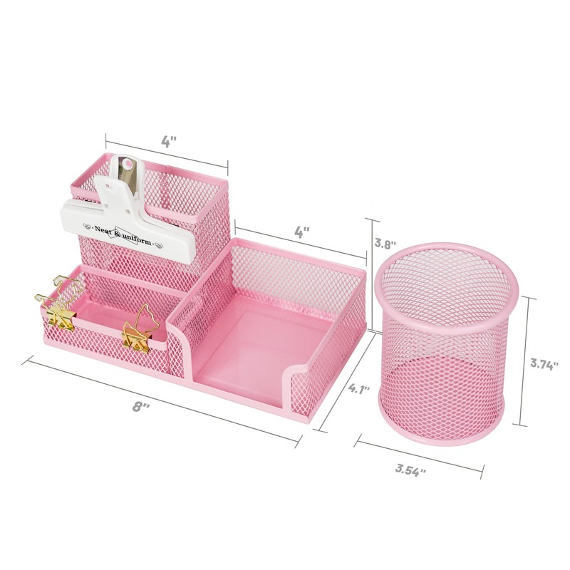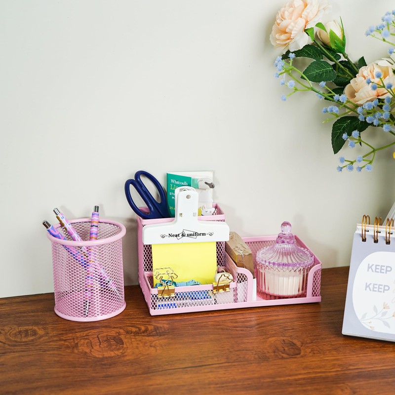 YOBRO Mesh Pen Holder Desk Organizer with a Pencil Cup, 3 Compartmnets Desk Caddy, Helpful Sticky Note Holder and Paper Clips Holder, Office Supply Organizer for School Home, Pink