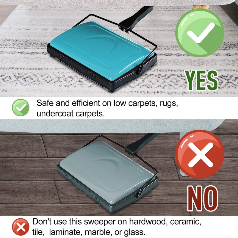 - Carpet Sweeper MULTIFUNCTIONAL: Safe and efficient on low carpets, rugs, undercoat carpets. Please DON'T use it on floors like hardwood, ceramic, tile, laminate, marble or glass. It only works best on carpets