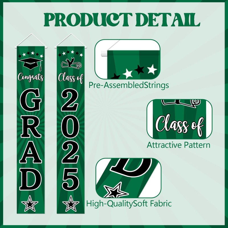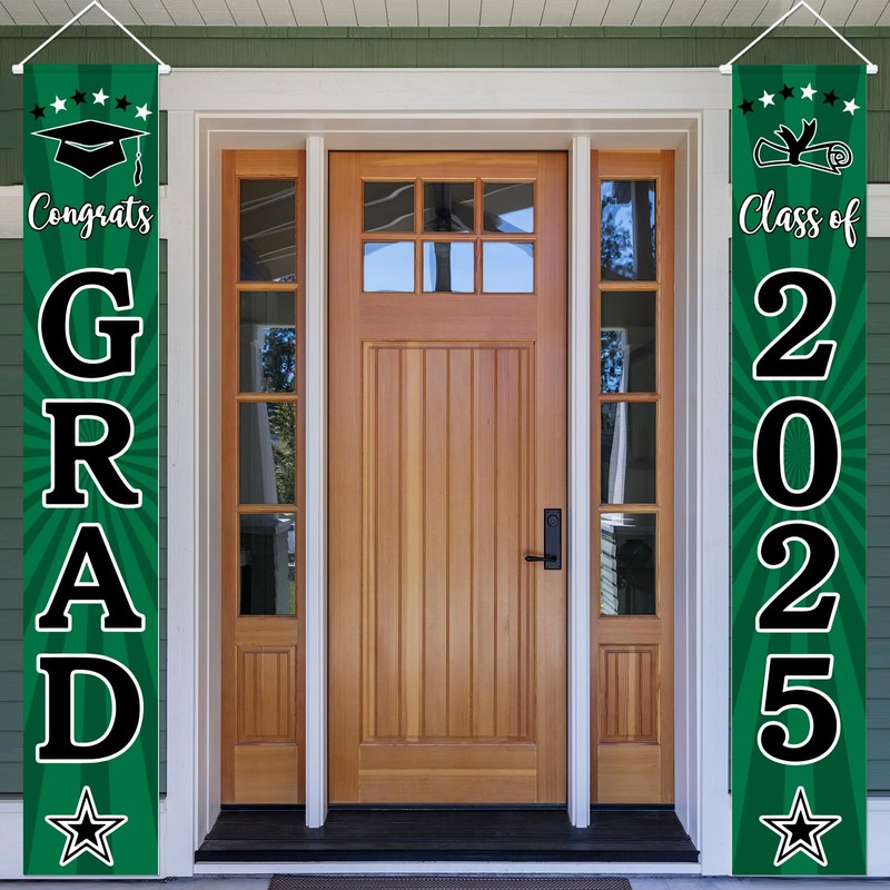 - 2025 GRADUATION PORCH BANNER: Designed with a black bachelor's cap and diploma, and a green congratulatory graduation backdrop, this porch sign adds to the atmosphere of hosting a graduation party and is perfect for a high school, college or university graduation party!