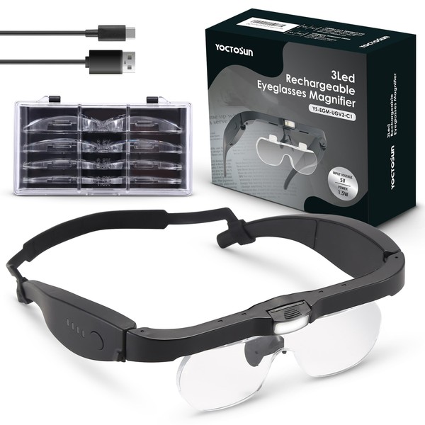 YOCTOSUN Magnifying Glasses with Light, Rechargeable Head Magnifier Glasses with 3 LED Lights and Detachable Lenses 1.5X, 2.5X, 3.5X, 5X, Magnifying Headset for Close Work Hobby Jewelry Crafts