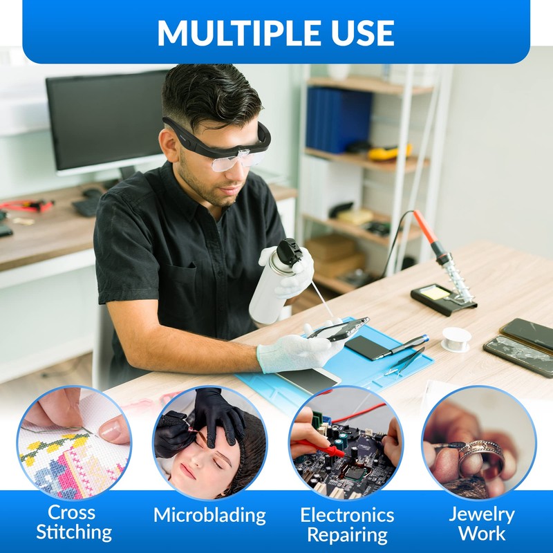 - Comfortable and Easy To Use: With ergonomics eyeglasses bracket, it is comfortable to wear ,better fixed magnifying glass in front of eyes. The rubber head strap can effectively prevent falling, thus it is easier to work for a long time.