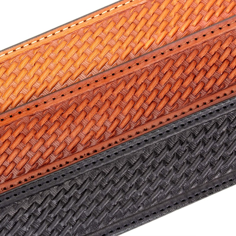 This handmade belt is crafted from a solid piece of beautiful American English Bridle Leather with a deep basket weave emboss.