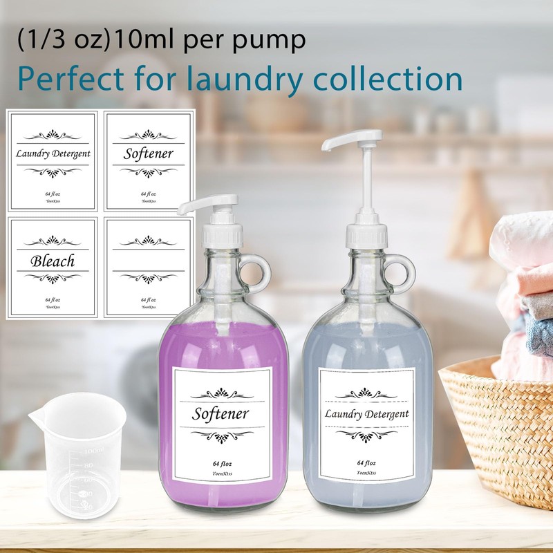 - Glass Dispenser Set for Laundry Room Organization: Equipped with 2 large flow pumps at 10ml(1/3 oz)per pump and a 100ml(3+1/3 oz) measurement cup for easy dispensing, for liquid laundry detergent, softener, bleach, laundry soap, washing powder; The printed labels and a blank label for customization make organization a breeze
