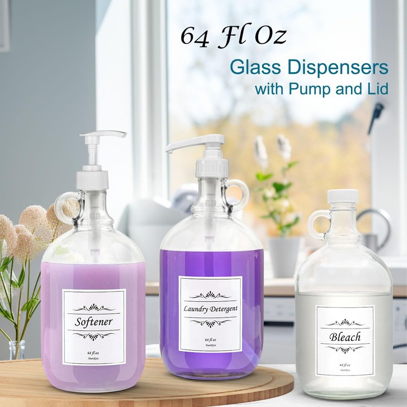 YoenKtss 2 Pack Laundry Detergent Dispenser with Pump and Lid, 64 Oz Glass Bottles for Laundry Room Organization and Storage, Fabric Softener Dispenser for Washer