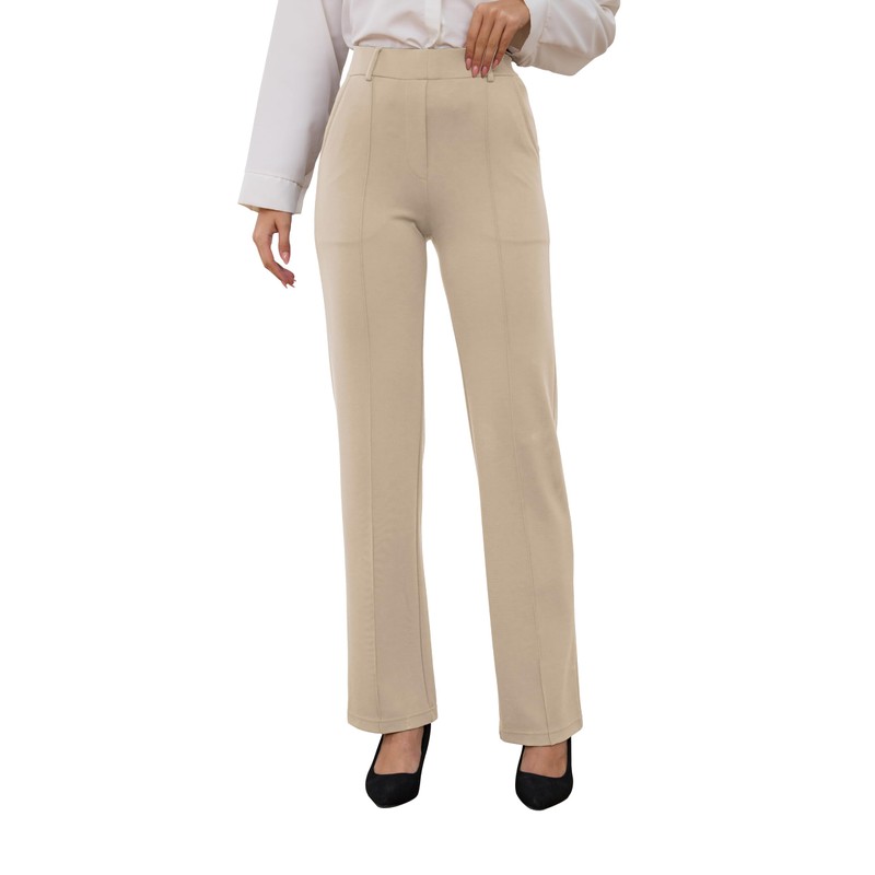 Yoga Dress Pants for Women Straight Leg Stretchy Pull On High Waisted Pants Woman Business Slacks Casual Work Office with Tuck Line Zipper Pockets 27" Beige XL