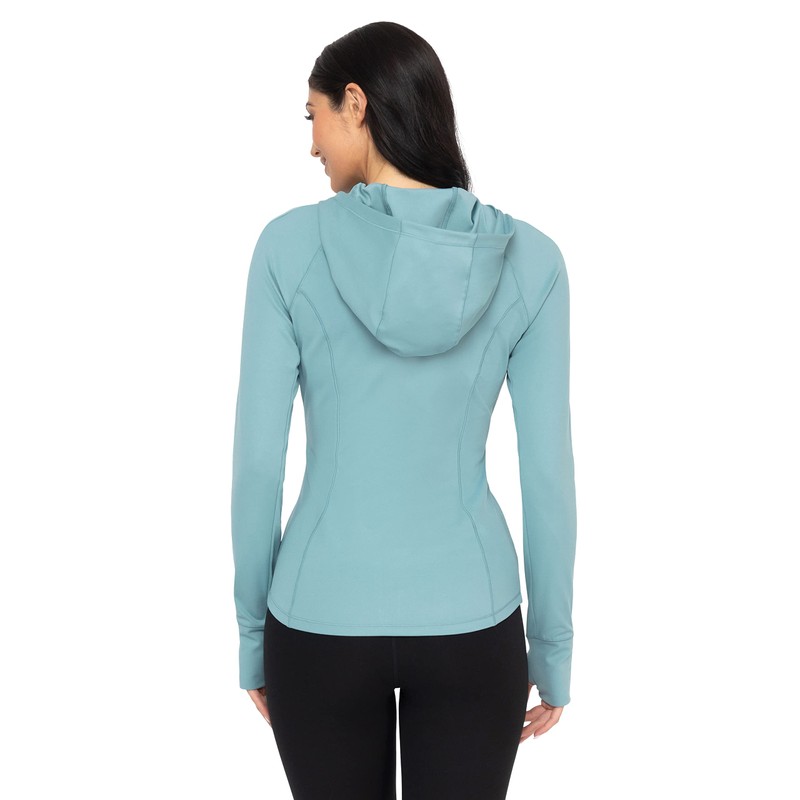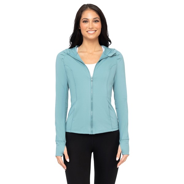 Yogalicious chamarra ligera con capucha y cierre completa con agujeros para los pulgares, Azul ahumado, XL