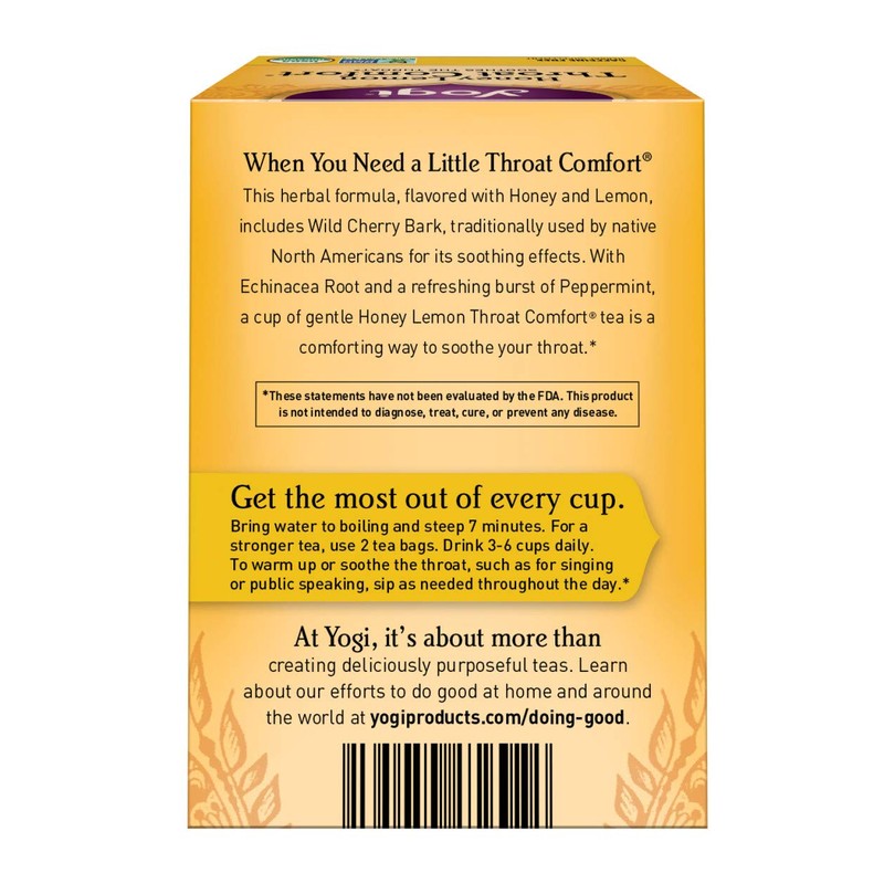 - FLAVOR: Yogi Honey Lemon Throat Comfort tea combines Honeybush Leaf, Licorice Root and Natural Honey and Lemon Flavors with Peppermint for a naturally citrus-y sweet blend.