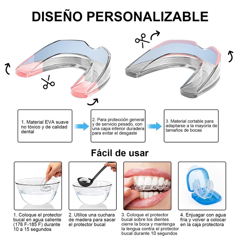 - Solución integral para el cuidado dental: Previene daños por apretamiento mandibular, reduce dolores de cabeza y mandibulares. Funciona como guarda dental para dormir y retenedor dental post-ortodoncia. Diseño personalizable con agua caliente para ajuste perfecto.