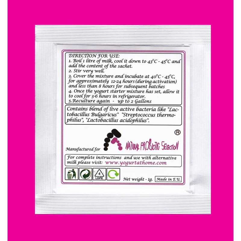 - One sachet is enough to make 1 quart of plain yogurt and re-cultured after