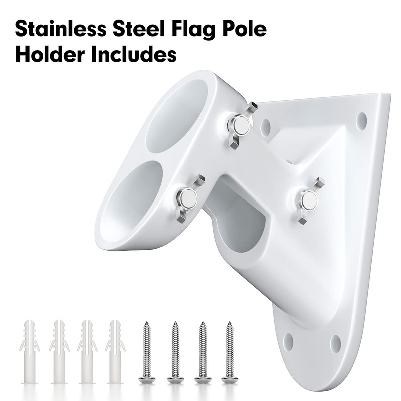 - Total Flag Pole Kit in White: An 3x5 ft American flag is constructed with sewn stripes, embroidered stars. A durable white stainless steel pole with ball topper. Steel mounting bracket with screws. 2 Plastic tangle-free adjustable rotating rings. Customer service & assemble instruction.