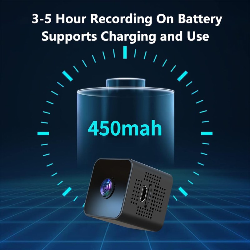 - HD 1080P: la mini cámara WiFi admite grabación de video HD de 1080p, lentes de 6 sensores para garantizar la visión nocturna también HD, soporte para detección de movimiento, pequeña pero potente. Diseño de batería integrada, sin energía también puede tener 60 minutos de autonomía.
