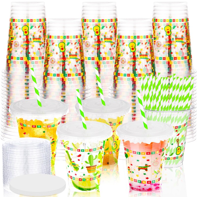- Package Includes: You will receive 100 disposable Fiesta party plastic cups with lids and straws, which is enough to meet your party needs. Mexican themed plastic disposable cups can be used and discarded without washing, saving you time to wash cups