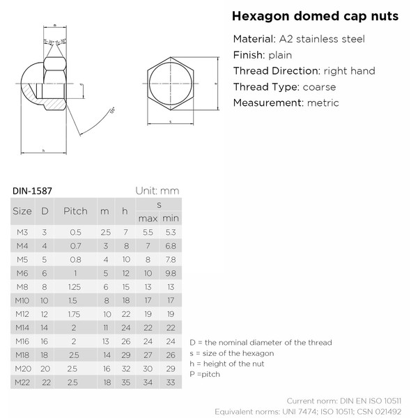 - Thread size: M8 x 1.25mm; Specifications met DIN 1587 / ISO 4161