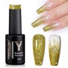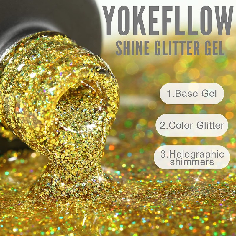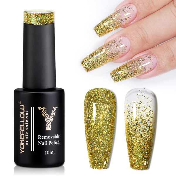 YOKE FELLOW Glitter Gel Nail Polish, Gold Holographic Sparkle Glitter Soak Off LED Gel Nail Lamp Cured for Lady Gifts 10ML