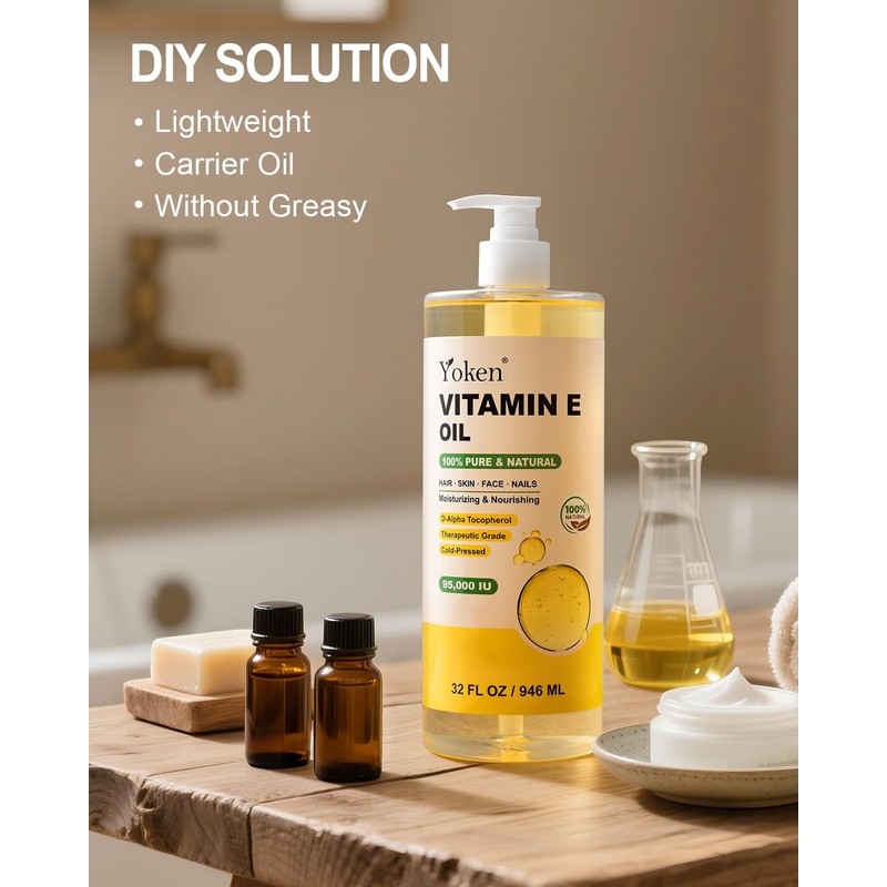 - Skin Protection:Yoken Vitamin e Oil Offers An Impressive 32 Oz Of Large Capacity,Ideal For Diy & Daily Use.Organic Vitamin e Oil Can Be Used For Scar, Stretch Marks, Dark Spots, Wrinkles, Lip Softening, Scars After Surgery.
