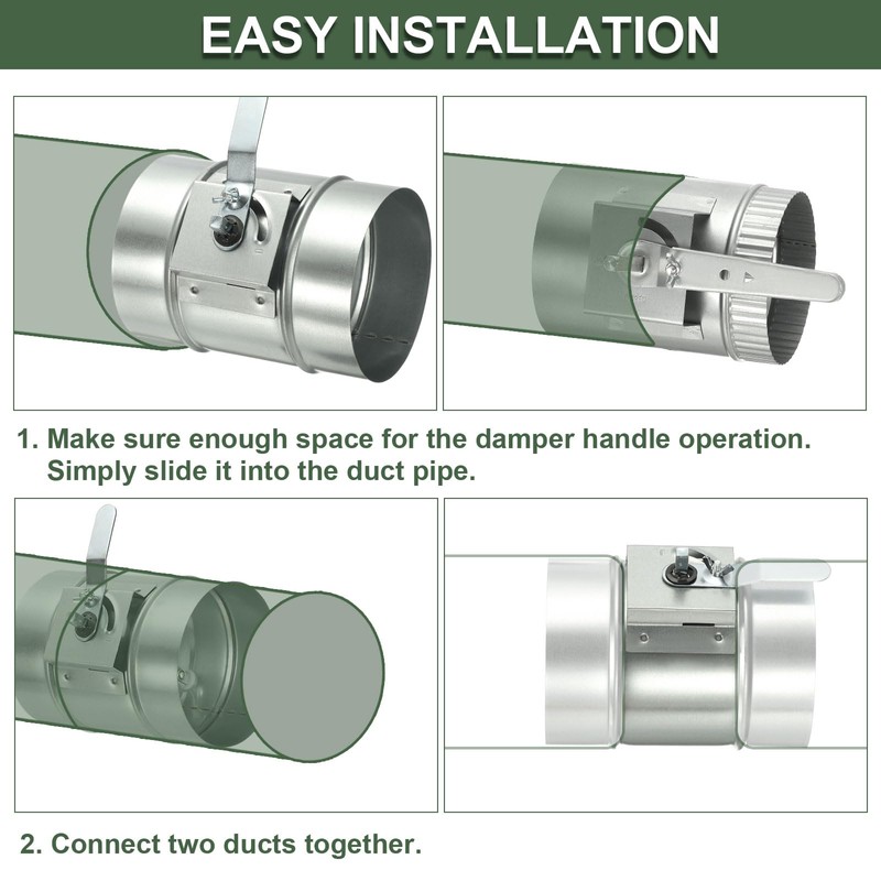 • SPECIAL DESIGNED: Manual Airflow Adjustment: Enjoy a comfortable environment with our damper sleeve, designed to use the manual handle on the valve to adjust the air volume from multiple angles. This is helpful to control room temperature and stop the backdraft. Crimped design: The end of the backdraft damper adopts a pleated design, which makes it effortless to push it into the duct. This design enables it to match other duct products precisely, ensuring a seamless connection.