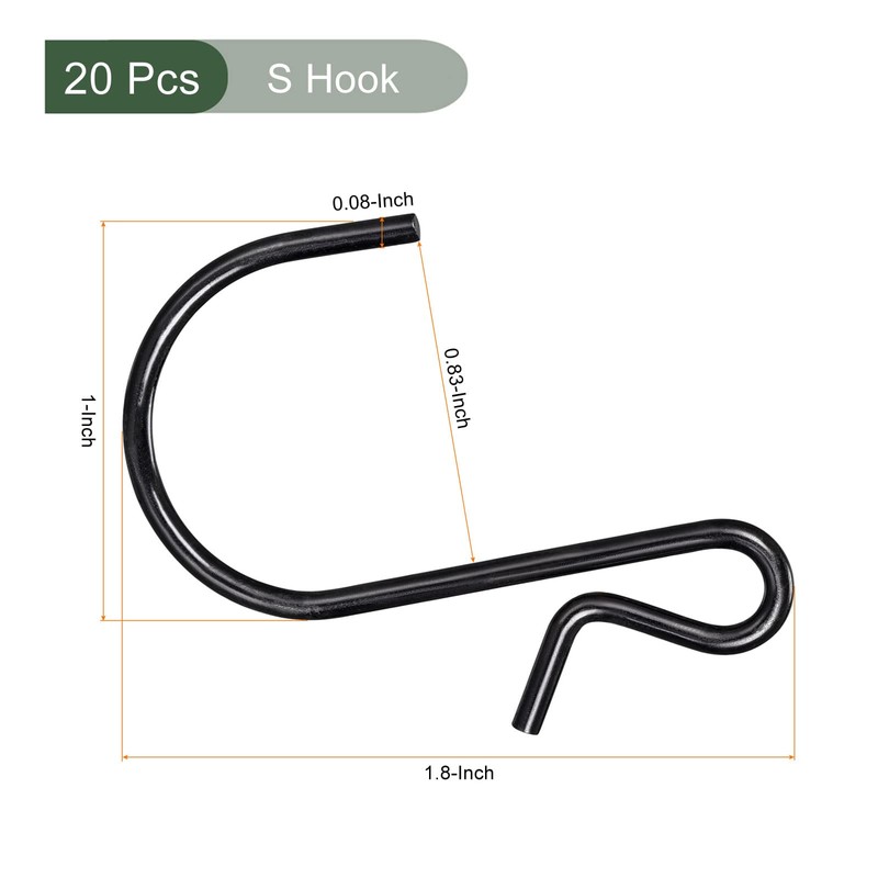 - √WHAT YOU GET - The package comes with 20 pcs black S shape hooks that measure 1.8-inch length and 1-inch width.