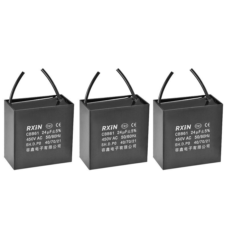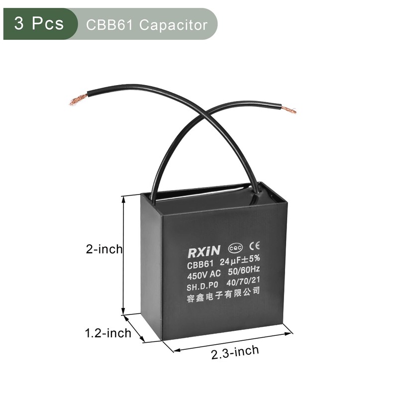 WHAT YOU GET - The package comes with 3Pcs CBB61 Capacitor with 2 Wires, the rated voltage is 450V AC, the rated capacity is 24uF (±5%), the rated frequency is 50/60Hz, the climatic category is 40/70/21, shell size: 58x31x57mm / 2.3x1.2x2.2 inch.
