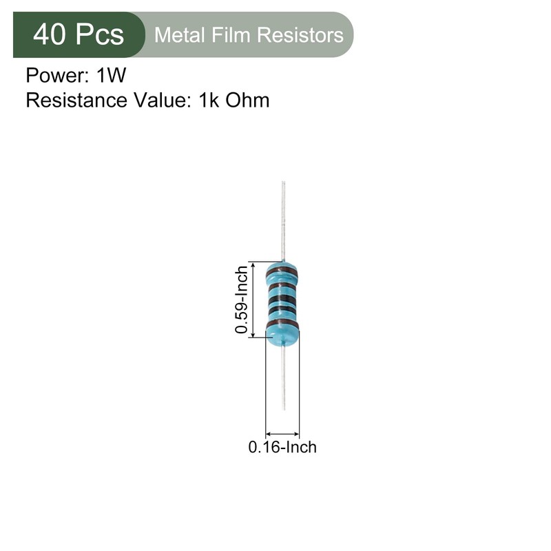 WHAT YOU GET - Package comes with 40 pieces metal film resistors: 4 x 15 mm (D*L). Total length(approx): 5cm Power: 1W; Tolerance: ±1%; Resistance: 1K Ohm; Color: Blue, Brown, Black, Silver Tone